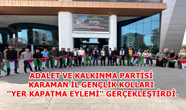 ADALET VE KALKINMA PARTİSİ KARAMAN İL GENÇLİK KOLLARI ''YER KAPATMA EYLEMİ'' GERÇEKLEŞTİRDİ:Sosyal Medya Hesabından Ypaılan Açıklamada;''AK Parti Gençlik Kolları (AK GENÇLİK) olarak 81 İlimizde ve tüm ilçelerimizdeki Starbucks şubelerinin içerisinde Filistin atkılarımızla yarım saat boyunca oturarak ‘