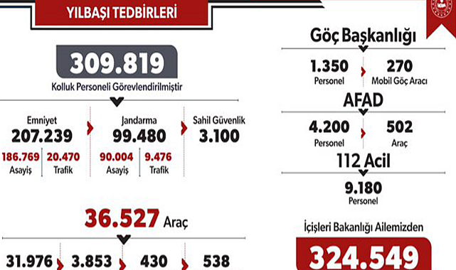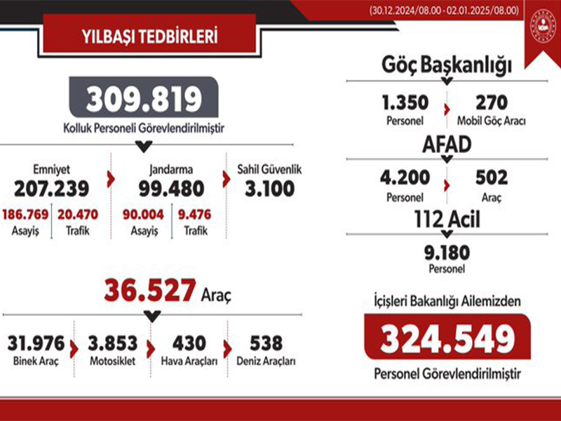 Yılbaşı Tedbirleri Kapsamında 309 Bin 819 Kolluk Personelimizi Görevlendirdi.İçişleri Bakanı Ali Yerlikaya, yılbaşı tedbirleri çerçevesinde yurt genelinde 309 bin 819 kolluk personelinin görevlendirildiğini açıkladı.Asayiş tedbirleri kapsamında Ülkemizde;