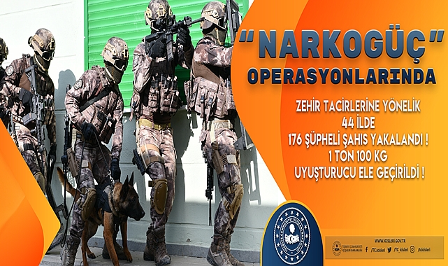 ''ZEHİR TACİRLERİNE YÖNELİK 44 İLDE EŞ ZAMANLI OLARAK DÜZENLENEN "NARKOGÜÇ" OPERASYONLARINDA 176 ŞÜPHELİ ŞAHIS YAKALANDI. MUHTELİF İÇERİKTE 1 TON 100 KG UYUŞTURUCU ELE GEÇİRİLDİ!